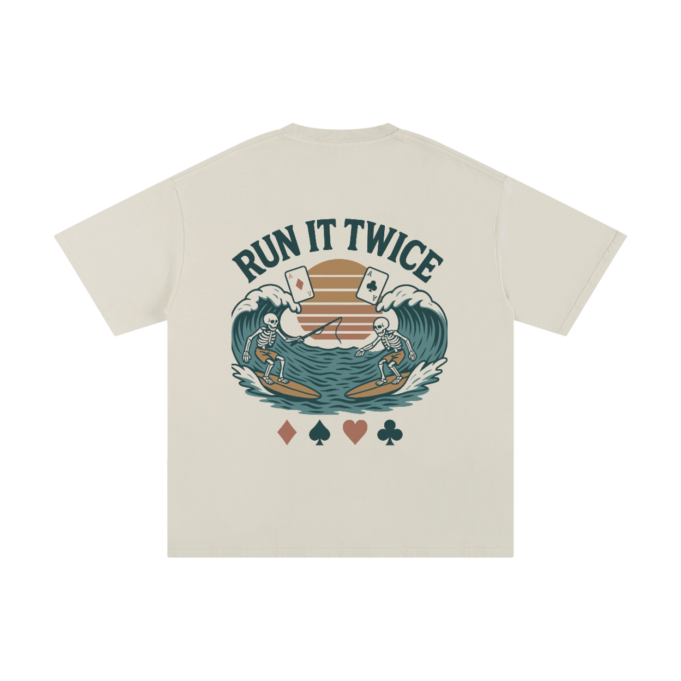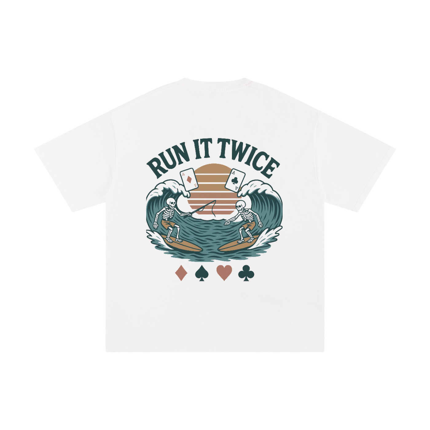 The Run It Twice Tee brings poker energy straight into the surf world with one of the most clever Surf Stack designs yet. The artwork features two skeleton surfers, each riding their own wave, each holding one card, with one skeleton casting a fishing rod to symbolize the poker move known as run it twice.